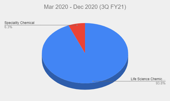 In Fiscal 2020 and in the nine months ended December 31, 2020, revenues from life science related specialty chemicals vertical accounted for 95.37% and 93.75%, respectively, of revenue from operations, while revenue from other specialty chemicals accounted for 4.63% and 6.25%, respectively, of revenue from operations, in such periods.