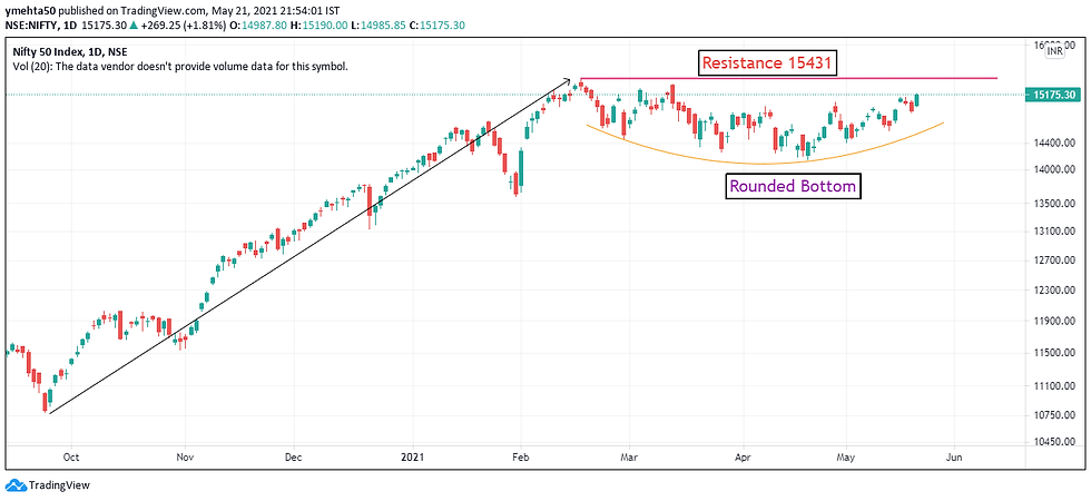 On daily time frame, Nifty is forming rounded bottom pattern. This happens when price is in uptrend and after that it consolidates for months. After breakout above resistance and all-time high 15431, one can expect uptrend to continue in Nifty.
