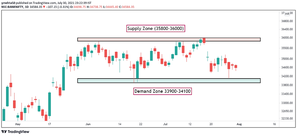 BankNifty has the same story as that of Nifty. It is also stuck in between this demand zone (33900-34100) and supply zone (35800-36000). A trader can use this consolidation phase to add stocks when BankNifty is in demand zone and sell stocks at supply zone. If BankNifty breaks and closes below demand zone, then we can expect some dips in the market. If BankNifty breaks and closes above supply zone, then we can expect upside rally again. Trader should watch for breakout/breakdown beyond these zones.