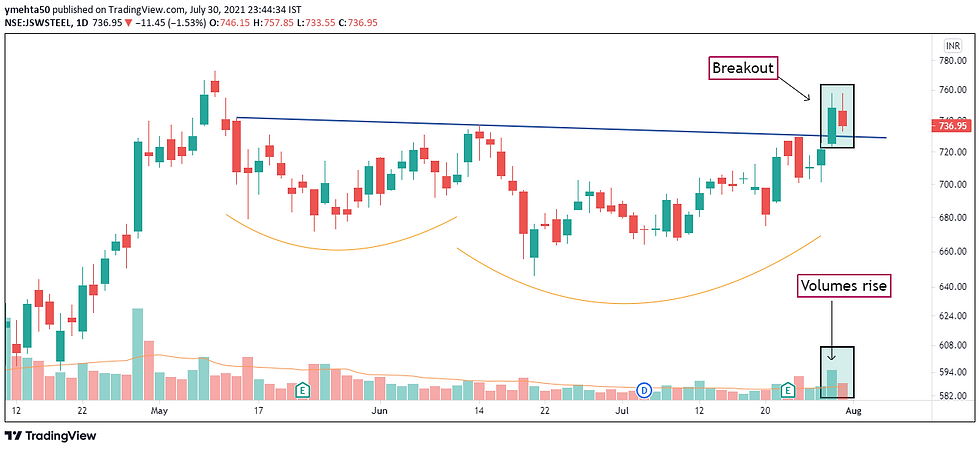 JSW Steel has given breakout after consolidating for more than two months. Similar setup as that of Hindalco, It is a rounded bottom breakout. Short Term and Momentum traders can track this stock for buy on dips opportunity. Stoploss would be 698.