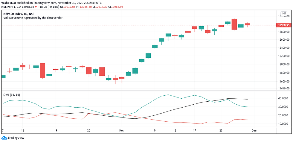 Nifty after giving a one sided move from 11600 to 13000 in November month is trying to consolidate near resistance region of 12900-13000. Unless we get a close above 13000 psychological level we can expect consolidation or small pullback near this region