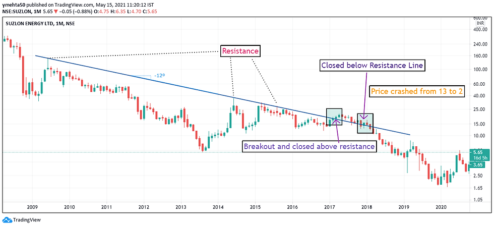 Suzlon monthly chart. Price had given closed above resistance line at 19, and then it closed below the resistance line after a few months at 14. Trader or investor would have lost around 26% in this. But that is still fine because after stock had crashed from 13 to 2, almost 85% crash. One has to minimize loss in the trading position.
